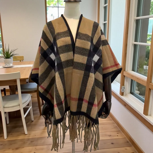 Heritage Plaid Luxe Poncho Shawl – One Size Cozy Fringe Wrap
