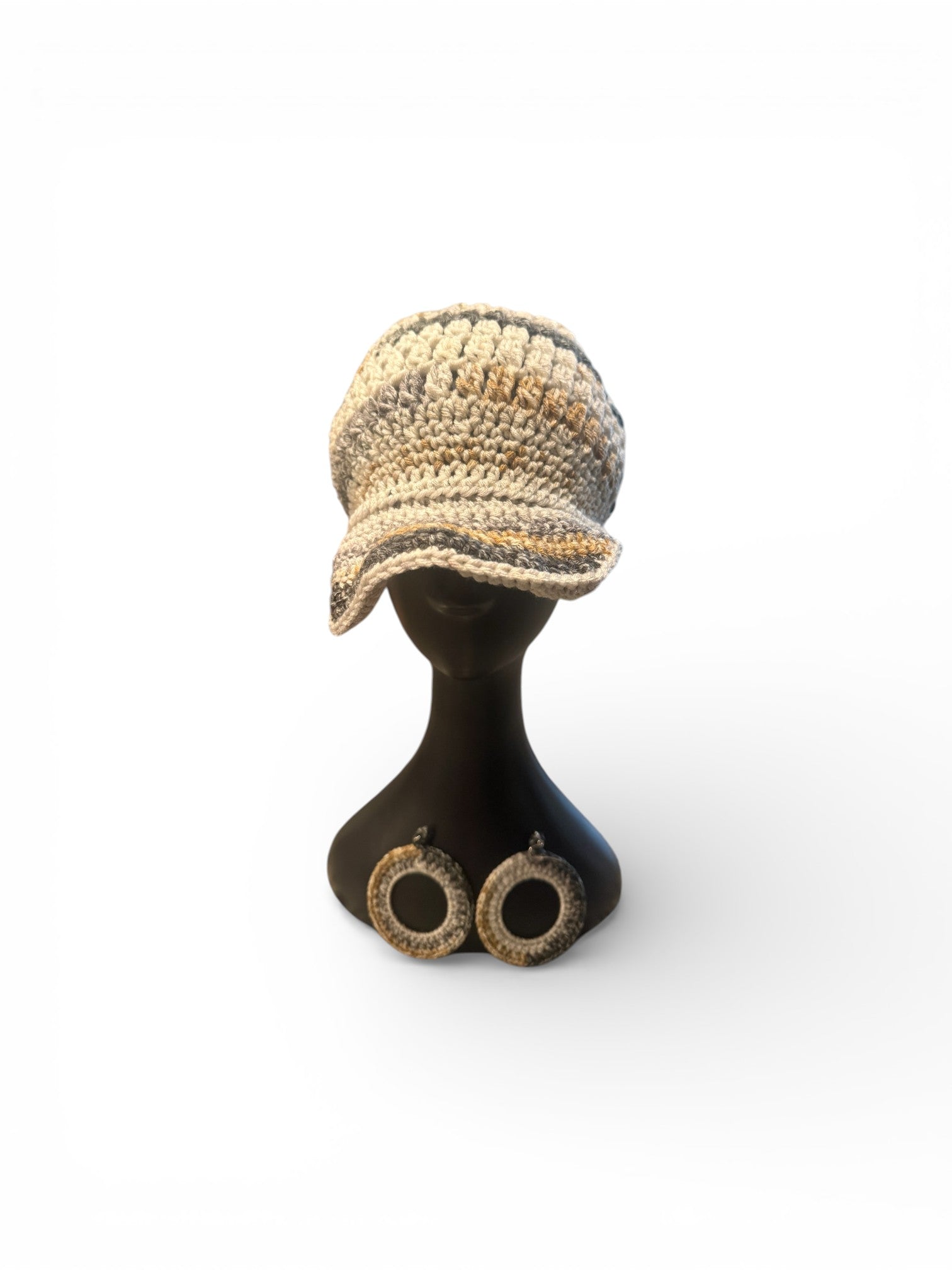 • Handcrafted crochet newsboy/cap with coordinating statement earrings