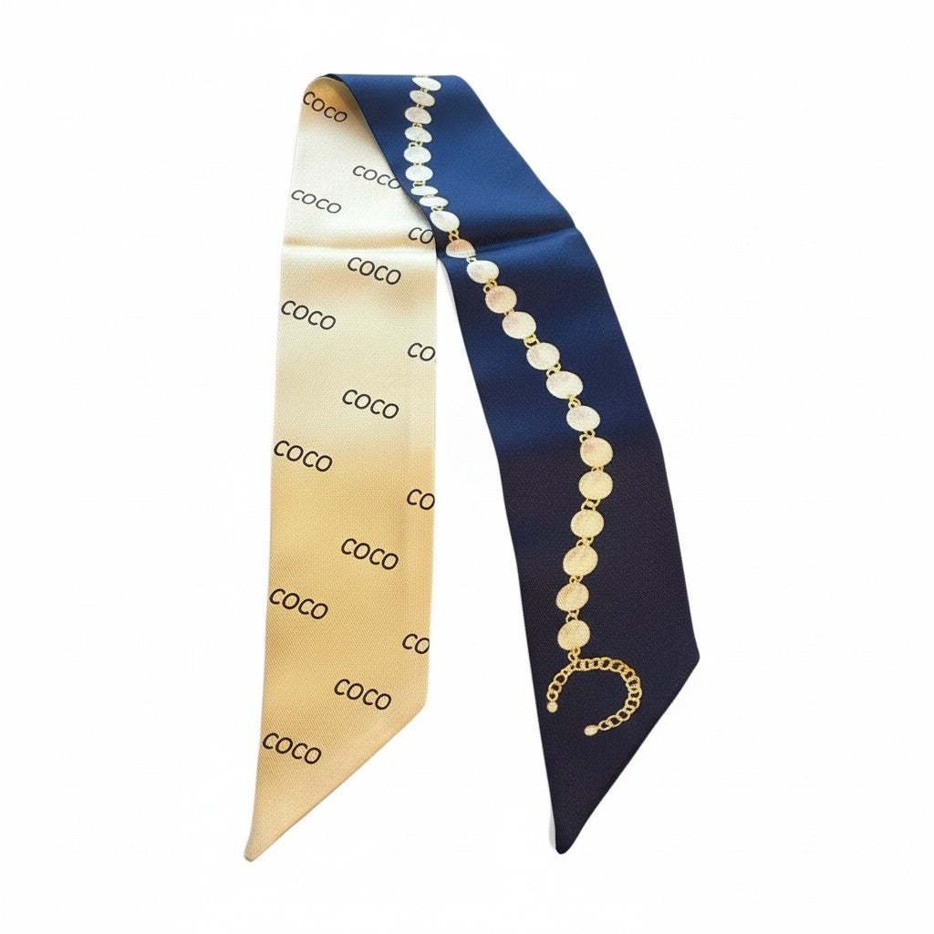 Add instant elegance to any handbag with the Legacy Coco Pearl Twilly. This dual-tone satin scarf features a chic navy-and-cream design, pearl-chain detailing, and a polished designer-inspired look. Perfect as a bag charm, handle wrap, wrist ribbon, or hair tie — a versatile accessory that elevates every outfit. Limited quantity.