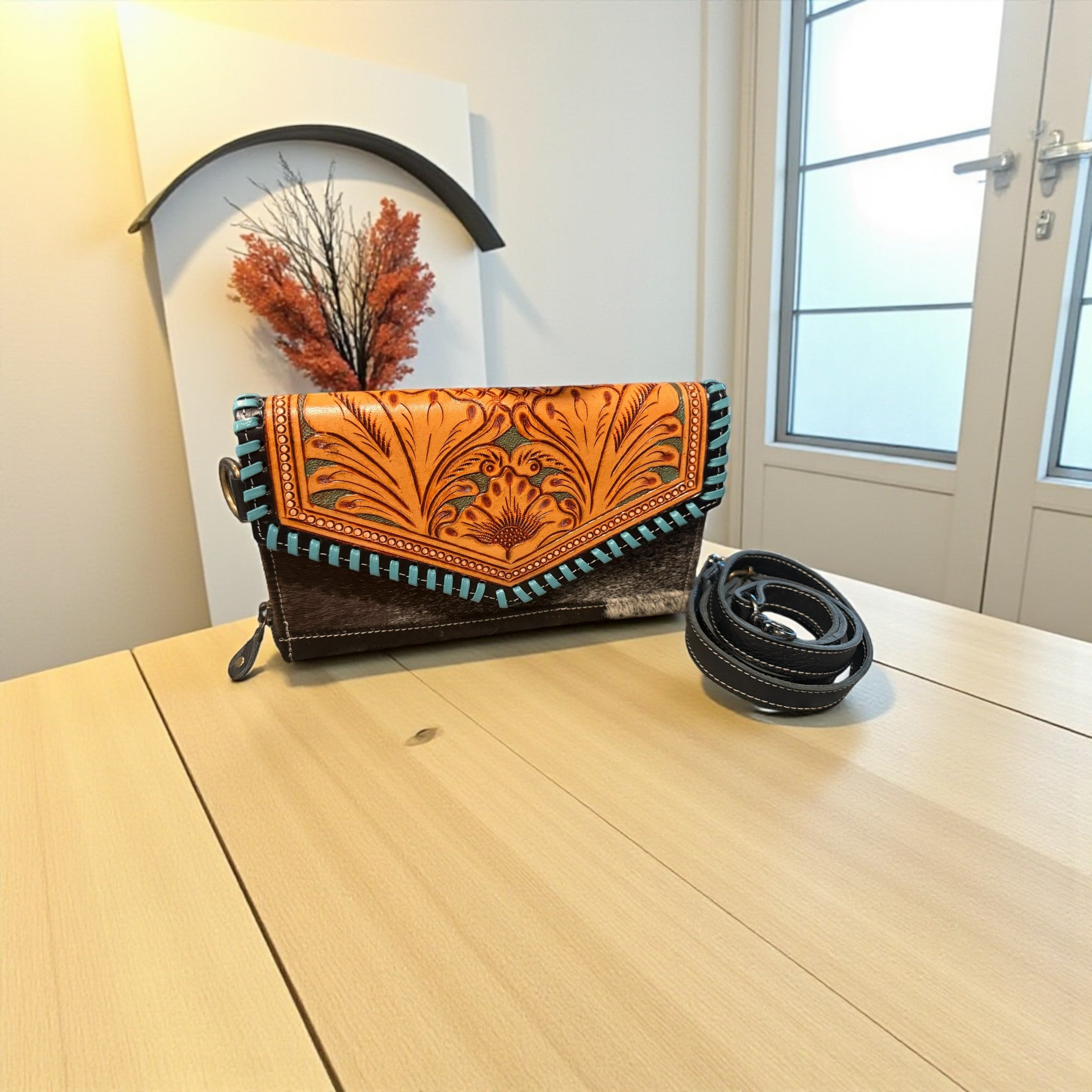 Saddle Bloom ( Dark Brown) Cowhide Crossbody Wallet – Hand-Tooled Western Chic